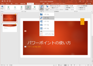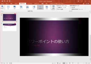 実際に再生して使用するプレゼンテーションファイルを作成しているなら、スライドの切り替えにいろいろなエフェクトをかけることが出来ます。魅力的なプレゼンになるように効果的なものが無いか見てみましょう。こちらは「画面切り替え」のメニューから設定できます。