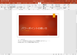 パワーポイントでは、スライドの外に、「ノート」という文字入力が可能なエリアがあります。ここに入力した文章は、例えばプレゼンの際に自身の手元で確認が出来、外部モニターやスクリーンには通常表示されないので、原稿として活用できます。